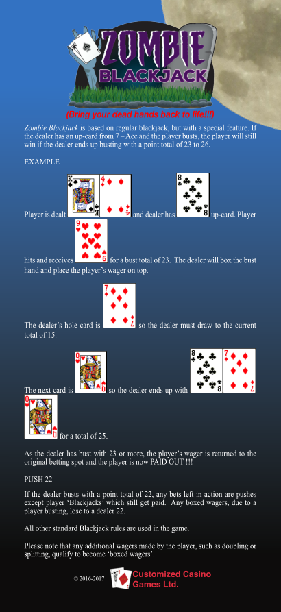 ゾンビブラックジャックは、ゲーム考案者のジェフ・ホールによるブラックジャックのバリエーションです。ディーラーが7でエースアップし、プレイヤーがバストした場合でも、プレイヤーにはまだ勝つチャンスがあるという考え方です。プレイヤーがバストしたベットは無効になります。ディーラーがバストした場合、ゾンビのように復活し、同額の配当が支払われます。このルールをクリアするために、「プッシュ22」ルールが適用されます。ディーラーが22でバストした場合、ブラックジャックを除く、バストしていないプレイヤーのハンドはプッシュとなります。