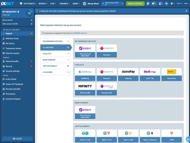 1XBETのバンキングシステムは素晴らしく、eWalletとクレジットカードによる入出金が可能です。出金スピードも素晴らしく、15分以内に出金されます。出金制限がないのも素晴らしい点です。