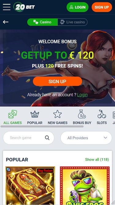 20Betカジノは Microgaming, Net Entertainment, Playtech, BetSoft, 1x2gaming, Amatic Industries, Big Time Gaming, ELK Studios, Evolution Gaming, EYECON, Ezugi, Genesis Gaming, Novomatic, Oryx, Play'n GO, playson, Quickspin, Relax Gaming, Thunderkick, Yggdrasil, Endorphina, Wazdan, GameArt, Booming Games, Pragmatic Play, Nolimit City, Red Tiger Gaming, Booongo, LuckyStreak, Spinomenal, Felix Gaming, Red Rake Gaming, Skillzzgaming, Fugaso, Belatra Games, Fantasma Games, FunFair, Platipus Gaming, Skywind, Spinmatic, Spadegaming, Triple Edge Studios, BGAMING, Northern Lights Gaming, Evoplay, Stormcraft Studios, Switch Studios, OneTouch, Pocket Games Soft, All41 Studios, Gluck Games, Mascot Gaming, TVBet, NetGame Entertainment, Gameburger Studios, Slot Factory, Neon Valley Studios, Golden Rock Studios, Spearhead Studios, Swintt, TrueLab Games, SpinPlay Games, Mancala Gaming, Expanse Studios, 7Mojos, SmartSoft Gaming, KA Gaming, Real Dealer Studios, GONG Gaming, On Air Entertainment, Buck Stakes Entertainment, Caleta Gaming, Games Global, Amusnet Interactive, Ainsworth, Ash Gaming, CT Interactive, EveryMatrix, Greentube, Leander Games, Push Gaming, Tom Horn Gaming, Gamomat, Noble Gaming, BF Games, Bally Wulff, Old Skool Studios, Foxium, Just For The Win, Wild Streak Gaming, Slingshot Studios, Fortune Factory Studios, RubyPlay, AvatarUX, Gamevy, Crazy Tooth Studio, High 5 Games, ReelPlay, Alchemy Gaming, Rarestone Gaming, Indi Slots, Black Pudding Games, Snowborn Games, Boomerang Studios, Hacksaw Gaming, Max Win Gaming, Gold Coin Studios, Gamzix, Triple Cherry, Peter And Sons, Absolute Live Gaming, Aurum Signature Studios, Onlyplay, Gamebeat, Area Vegas, RAW iGaming, Bombay Live, Leap Gaming, TaDa Gaming, Winfinity, 3 Oaks Gaming, Amigo Gaming, Wishbone Games, Spribe, Circular Arrow, 1spin4win, Gaming Corps, BetSolutions, Nailed It! Games, Neko Games, Reel Kingdom, Oros Gaming, JVL, Indigo Magic, Popiplay, Live88, ICONIC21 and Galaxsysを採用しており、インターネットブラウザからアクセスできるウェブベースのインターフェースを備えています。サイトはデザイン性に優れ、操作も簡単で、スポーツブック、カジノ、ライブディーラーカジノのタブが用意されています。モバイルサポートも搭載されているため、スマートフォンやタブレットからプレイできます。Blackjack