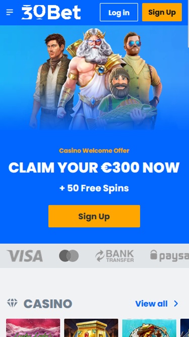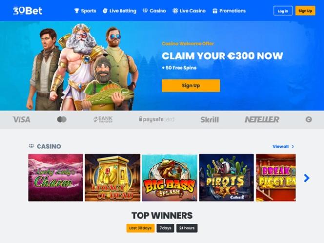 これはオンラインカジノとスポーツベッティングのウェブサイトです。一見すると、運試しをしたり、最新のオンラインカジノゲームを試したりするのに、整理された素敵な場所のように見えます。30Bet.comは、キュラソーゲーム管理委員会の認可と規制を受けており、ドイツとイギリスのプレイヤーを対象としています。