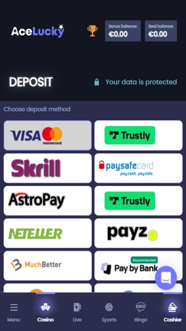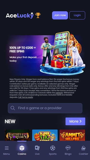 Ace Lucky Casinoは Microgaming, Net Entertainment, Playtech, 1x2gaming, Barcrest, Big Time Gaming, ELK Studios, Evolution Gaming, EYECON, lightningboxgames, Play'n GO, Rabcat, Thunderkick, Wazdan, Pragmatic Play, Nolimit City, Red Tiger Gaming, Spinomenal, Skillzzgaming, Skywind, Triple Edge Studios, Northern Lights Gaming, Stormcraft Studios, Switch Studios, All41 Studios, Gameburger Studios, Pulse 8 Studios, Neon Valley Studios, Shuffle Master, SpinPlay Games, Real Dealer Studios, GONG Gaming, On Air Entertainment, Buck Stakes Entertainment, Games Global, 2by2 Gaming, Blueprint Gaming, Games Warehouse, NextGen, ProgressPlay, Tom Horn Gaming, WMS, Inspired Gaming, SG Interactive, Red7Mobile, CORE Gaming, Scientific Games, Reel Time Gaming, Iron Dog Studio, Old Skool Studios, Foxium, Betdigital, Just For The Win, PearFiction Studios, Wild Streak Gaming, Slingshot Studios, Fortune Factory Studios, Gamevy, Crazy Tooth Studio, ReelPlay, Alchemy Gaming, Rarestone Gaming, Black Pudding Games, Snowborn Games, Hacksaw Gaming, Gold Coin Studios, Half Pixel Studios, Eurostar Studios, Aurum Signature Studios, Lucksome Gaming and Leap Gamingを採用しており、カジノゲームはウェブベースのインスタントプレイプラットフォームを通じて提供されています。また、モバイルプレイにも対応しているため、スマートフォンやタブレットからゲームをプレイできます。