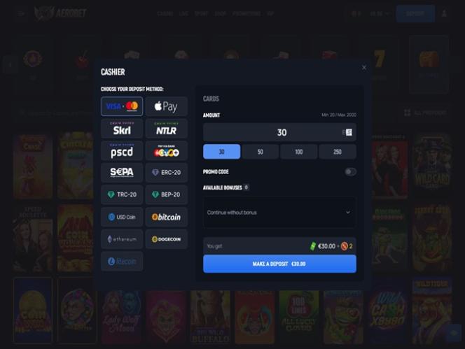 Aerobetでは、ロイヤルティ特典に加え、プレイヤーの皆様は滞在中、数多くのプロモーションに参加したり、様々なボーナスを獲得したりすることができます。まず第一に、新規プレイヤーの皆様は、複数の入金マッチングオファーを含む、豪華なウェルカムパッケージをご利用いただけることをご承知おきください。
