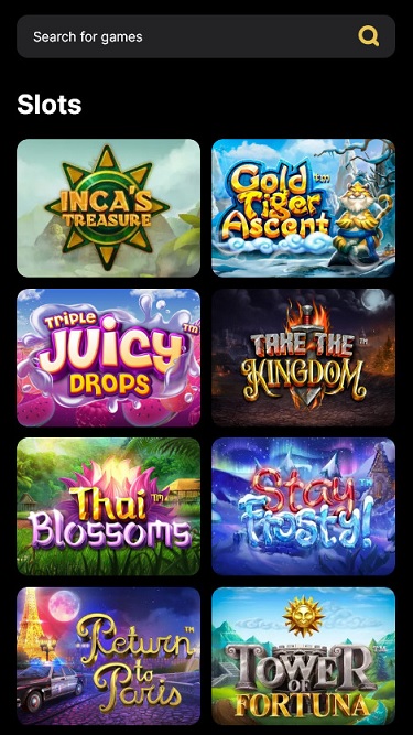 このプラットフォームはダークモードのテーマを採用しており、オンラインカジノでは珍しい、実に素晴らしいレイアウトとなっています。ホームページはヘッダーのすぐ下に2つの独立したセクションがあり、完璧なバランスが保たれています。1つは「人気ゲーム」、もう1つは「ライブカジノ」です。スポーツやロイヤリティプログラムのセクション、そしてカジノサービスに関する詳細情報も、そのすぐ後に続いています。
