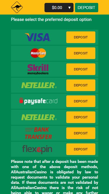 All Australian Casinoは、オーストラリアのプレイヤーを対象としたオンラインベッティングサイトであり、L&L Europe Ltd.が所有・運営しています。All Australian Casinoは、同じく地理的に拠点を置くAll British Casinoの姉妹サイトです。2013年の設立以来、All Australian Casinoは迅速な出金処理時間、豊富なゲームライブラリ、そして豊富なプログレッシブジャックポットで高い評価を得ています。カジノ情報