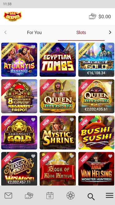 All Jackpots Casinoは Microgaming, Net Entertainment, Evolution Gaming, Ezugi, Rabcat, Pragmatic Play, Red Tiger Gaming, Triple Edge Studios, Northern Lights Gaming, Stormcraft Studios, Switch Studios, Electric Elephant Games, All41 Studios, Gameburger Studios, Pulse 8 Studios, Neon Valley Studios, SpinPlay Games, Real Dealer Studios, GONG Gaming, On Air Entertainment, Buck Stakes Entertainment, Games Global, Foxium, Just For The Win, PearFiction Studios, Slingshot Studios, Fortune Factory Studios, Crazy Tooth Studio, Alchemy Gaming, Snowborn Games, Gold Coin Studios, Half Pixel Studios, Eurostar Studios and Aurum Signature Studiosを採用しており、カジノのウェブベースプラットフォームで数百ものゲームを提供しています。インターネット接続が遅い方のために、ダウンロード版もご用意しています。カジノはモバイルサイトも充実していますが、モバイル端末ではゲームの提供数は限られています。