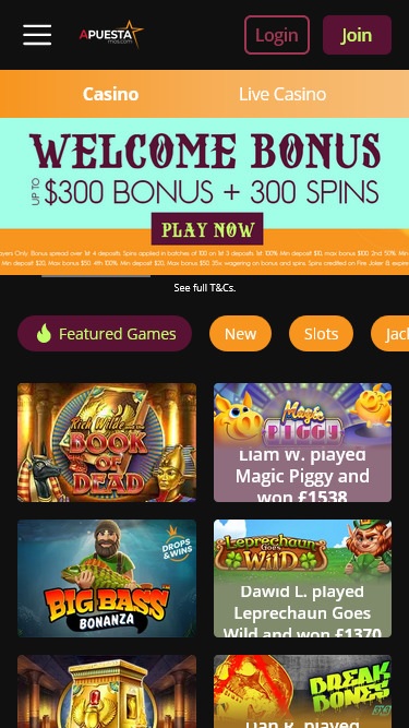 Apuestamos Casinoは、2020年に開設されたオンラインベッティングサイトです。Aspire Global International Ltd.が運営しています。ラテンアメリカのゲーム市場に焦点を当てていますが、世界中の他の国々のプレイヤーにもサービスを提供しています。豊富なゲームライブラリ、充実したロイヤルティプログラム、そして優れた決済スピードを誇るこのカジノは、プレイするのに最適な場所です。カジノ情報