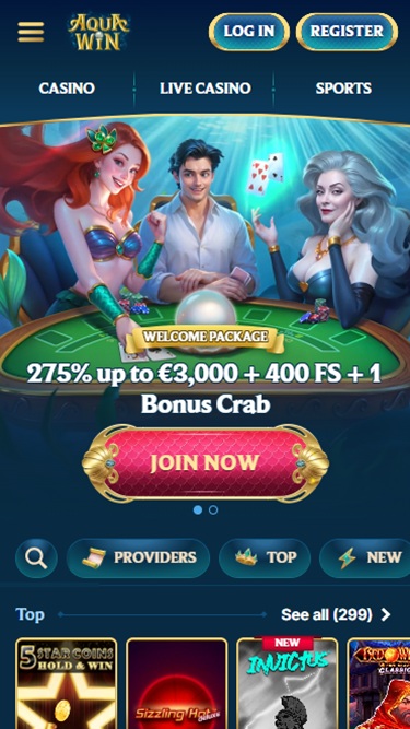 AquaWin Casinoは、サイトにアクセスした瞬間から強烈な第一印象を与えます。その名の通り、水中をテーマにした空間で、鮮やかなブルーの背景と豊かなゴールドのアクセントが、新鮮で魅力的な雰囲気を醸し出しています。ナビゲーションはシンプルで、各セクションが分かりやすいため、必要な情報を探すのに時間を無駄にすることはありません。