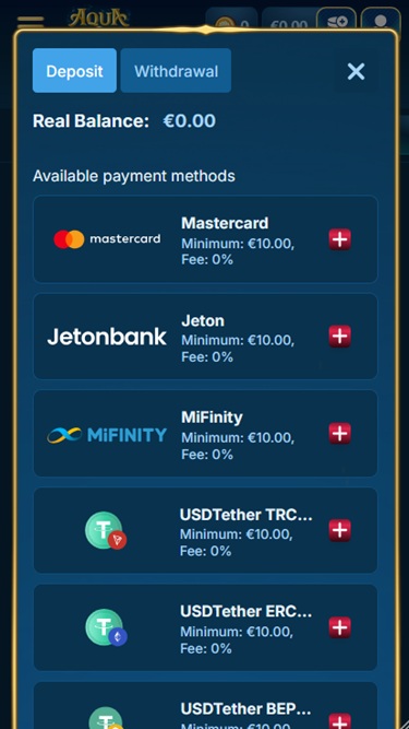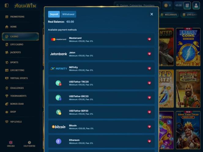 AquaWinのプレイヤーは、カジノアカウントへの入金と出金に、 Visa 、 Mastercard 、 Skrill 、 Neteller 、 Paysafecard 、 MiFinity 、 MuchBetterなど、多数の決済方法をご利用いただけます。さらに、ビットコイン、ビットコインキャッシュ、カルダノ、ドージコイン、イーサリアム、ライトコイン、 USDコイン、テザー、リップルなど、複数の暗号通貨で資金を管理できます。