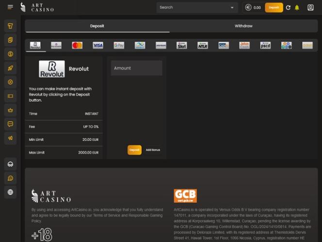 Art Casino は、キュラソーの法律に基づいて規制され、Antillephone NV によってライセンスされているオンライン カジノです。