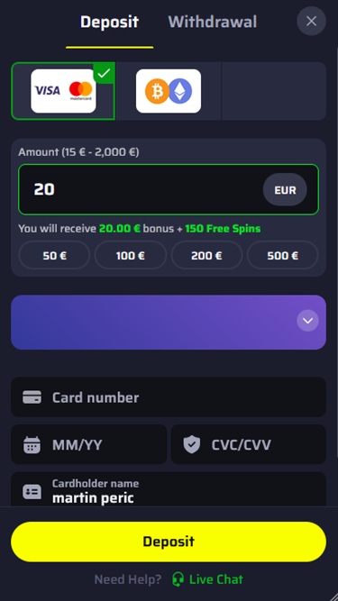 お支払い方法に関しては、 Visa 、 Mastercard 、 Jeton 、 Neosurf 、 Skrill 、 Neteller 、銀行振込、 Astropayなどの従来の決済方法をご利用いただけます。また、入出金のメインの銀行決済方法としてビットコインをご利用いただくことも可能です。