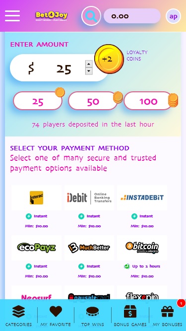 Bet4Joy カジノでは賭け金 10 ドルごとに 1 ポイントのコンプ ポイントが提供され、プレイヤーはカジノで 100 ポイントを 1 ドルの現金と交換できます。