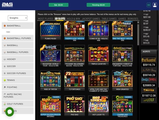BetAnySportsでは豊富なスロットゲームをご用意しており、多数のビデオスロットに加え、定番の3リールゲームも豊富に取り揃えています。モバイルスロットもプレイ可能で、高額賞金を獲得できるプログレッシブジャックポットもいくつかあります。