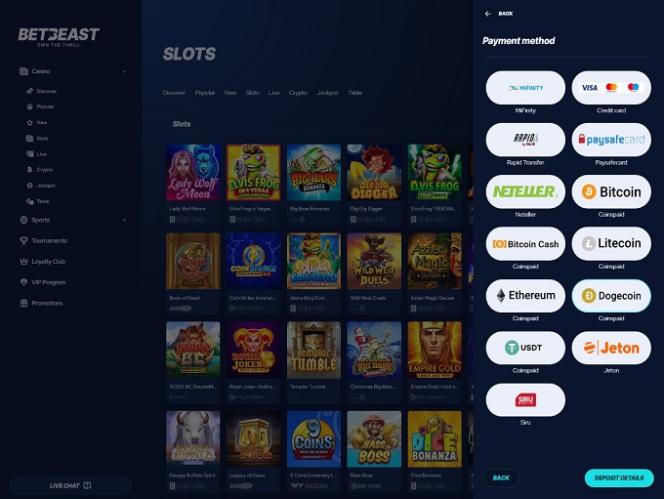 BetBeast のキャッシャーは、決済カード、 Neteller、Skrillなどの広く使用されている電子ウォレット、銀行電信送金、暗号通貨決済方法など、さまざまな一般的な銀行オプションをサポートしています。
