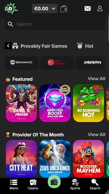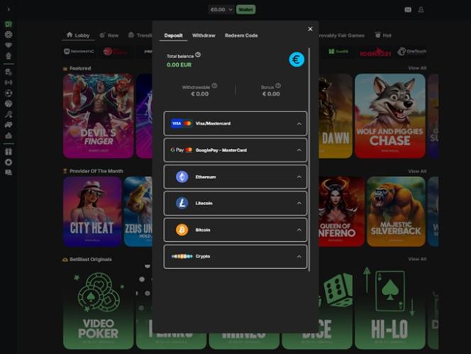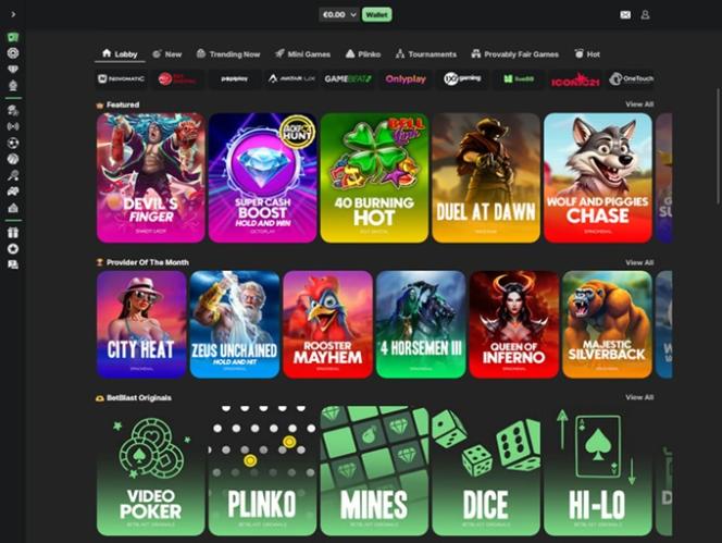もちろん、 Aviator、Tap the Pot、Plinko、Super Beto Crash、Gravity Plinko、Diamond Digger、Plinko Rush、Courier Sweeper、Super Sixers Xtreme、Jet Xなどの多数のインスタント クラッシュ ゲームもプレイできます。Betblast Casino には、ビデオ ポーカー、クラッシュ、マインズ、ダイス、ハイロー、ダイヤモンドなど、オリジナル ゲームも多数用意されています。