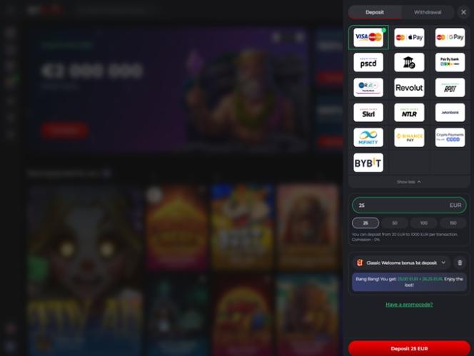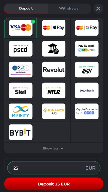 BetBonaでは、カジノアカウントへの入金と出金に、 Visa 、Mastercard、銀行振込、Jeton、 Skrill 、 Neteller 、 Google Pay 、 Apple Pay 、Revolutなど、複数の決済方法をご利用いただけます。また、ビットコイン、ビットコインキャッシュ、ドージコイン、イーサリアム、ライトコイン、ソラナ、トロン、 USDコイン、テザー、リップルなど、多数の暗号通貨もご利用いただけます。