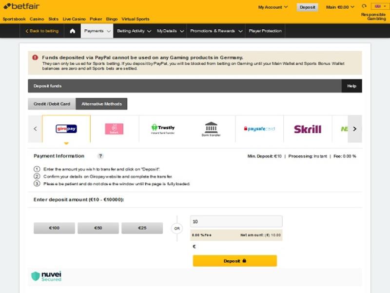 Betfairの利用規約をよく見ると、プレイヤーに対して不公平な扱いや搾取的な行為は一切ありません。Betfairの銀行システムは堅牢で、eWallet、クレジットカード、電信送金による入出金が可能です。出金時間も比較的早く、プレイヤーにとって安定した入出金プラットフォームとなっています。