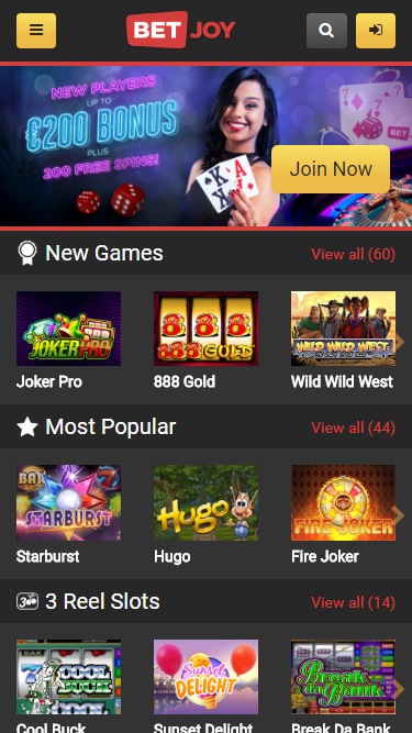 BETJOYカジノは、キュラソー島のBlue Gaming Groupによって2015年に設立されたオンラインベッティングサイトです。豊富なゲーム、ボーナスの賭け条件、そして非常にリーズナブルな出金条件を誇り、BETJOYはプレイするのに最適な場所です。