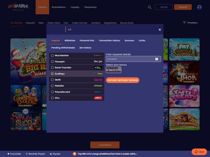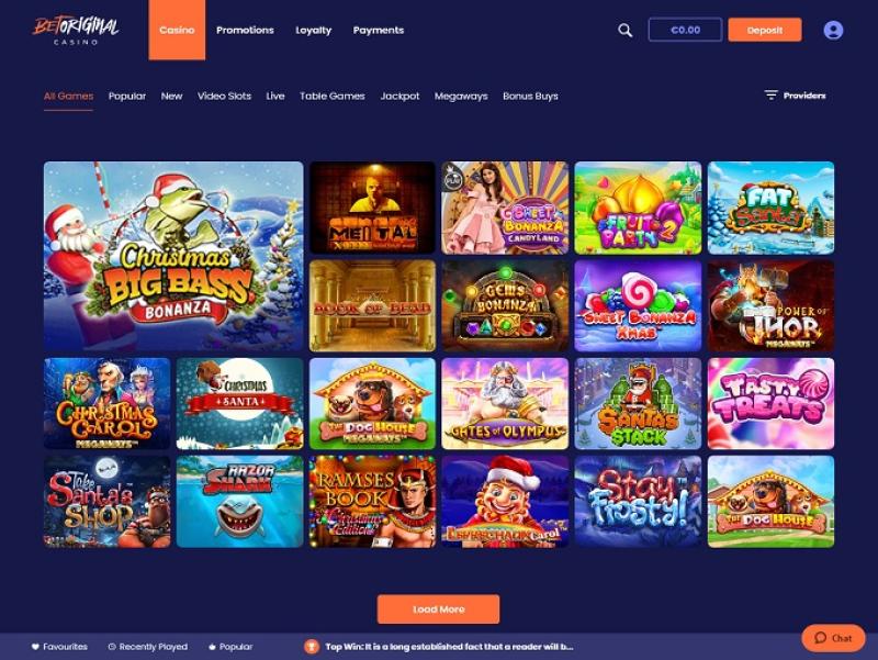 BetOriginal には、Lucky Dragons、Go! など、数多くの人気スロット タイトルがあります。モンキー、ドワーフ・ゴールド・デラックス、ホットサファリ、ビューティーサロン、ダイス・アンド・ファイア、シュガー・ラッシュ、ヴェネツィアのカーニバル、ダックス・アンド・エッグス、テイルズ・オブ・エジプト、グレイブ・グラバーズ、レディ・ゴディバ、ボイジャーズ・クエスト、ラッキー・デイ・アット・ザ・レース、スロット・ダンク、ラッキー・フィッシング、ミノタウロスの探求、マッド・オーケストラ、ニュー・テイルズ・オブ・エジプト、シーア派サファヴィー朝、レッドビアード&カンパニー、リール・ギャングスターズ、グロリアス・ローマ、クール・ストーン・エイジ、レリジョン・オブ・チャンピオンズ・ブラジル、サマー・パーティー、トランシルバニア、ウィッチズ・コールドロン、マジック・クリスタルズ、ブラック・ダイヤモンド、ハッピー・サーカス、オーシャン・ファンタジー、グレイブヤード・シフト、ドワーフ・ゴールド、ビンゴ・スロット、フォレスト・トレジャー、フルーツ・スロット、メリーベルズ、フォレスト・フレンジー、ロスト・インカのゴールド、ロト・マニア、オービタル・マイニング、グレート・リーフ、バイキング&ストライキング、スウィート・サプライズ、アラジンのトレジャー、マイティコング、7モンキーズ、キャットファーザー、ダギーズ・ディライツ、ブラックダイヤモンド1ライン、ファラオの宝、トロピカルパンチ、ナイトドリーム、ビッグバン、ダイヤモンドは永遠に、ロシアンアタック、ベリーフレーバー、スウィーツサプライズ3ライン、ブラックダイヤモンド、ベオウルフ、西遊記、キャットファーザーパートII、3ジーニーズウィッシュ、ヘラクレス・サン・オブ・ゼウス、ドラゴンキングダム、888ゴールド、クイーンオブゴールド、アイリッシュチャーム、クイーンオブアトランティス、イベントホライゾン、ラッキーセブン、メガグラムライフ、フルーツゼン...