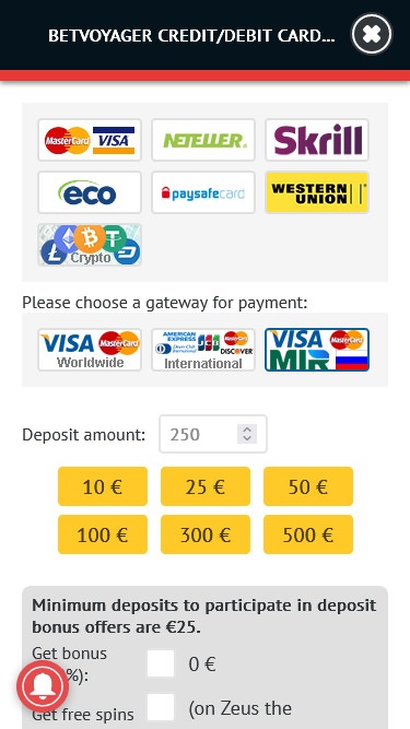 BetVoyagerカジノのバンキングシステムは非常に優れており、Visa、MasterCard、Paysafecard、Eco、WMZ、WME、Skrill、Netellerなどの決済サービスが利用可能です。入金処理時間は1~3営業日で、1日あたりの出金限度額は5,000ユーロです。これは、プログレッシブジャックポットを獲得した場合にはデメリットとなる可能性があります。