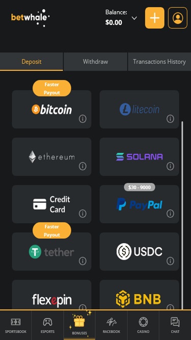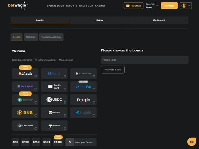 BetWhale Casinoでは、入金と出金をより簡単にするために、プレイヤーが様々な決済方法を選択できるようにしています。従来の決済方法としては、 Visa 、 Mastercard 、 American Express 、銀行振込、 PayPalなどがご利用いただけます。最新の決済方法としては、ビットコイン、ビットコインキャッシュ、カルダノ、ドージコイン、イーサリアム、ソラナ、ライトコイン、 USDコイン、テザー、リップルなど、多数の暗号通貨がご利用いただけます。