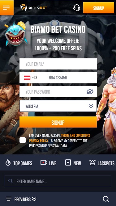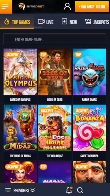 Biamo.Betカジノプラットフォームは、ダークなテンプレートに金色のディテールをあしらい、魅力的なオンラインギャンブルの雰囲気を醸し出しています。ゲームを中心とした非常にモダンなデザインで、ゲームのサムネイルに邪魔されることなく、インターフェースは非常に使いやすく、登録手続きも瞬時に完了します。