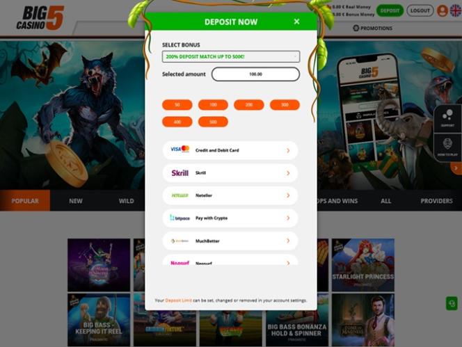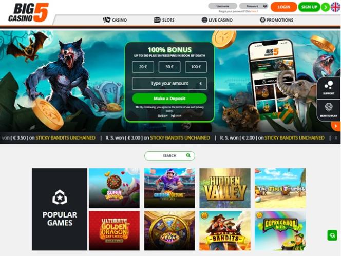 Big5カジノは Microgaming, Net Entertainment, BetSoft, Amatic Industries, Big Time Gaming, ELK Studios, Evolution Gaming, iSoftBet, Oryx, Play'n GO, Quickspin, Rabcat, Relax Gaming, Thunderkick, Wazdan, Realistic Games, Booming Games, Pragmatic Play, Red Tiger Gaming, Red Rake Gaming, Kalamba, Spin Games, Triple Edge Studios, Northern Lights Gaming, Stormcraft Studios, Electric Elephant Games, All41 Studios, Gameburger Studios, Neon Valley Studios, Golden Rock Studios, SpinPlay Games, 7Mojos, Games Global, 2by2 Gaming, Merkur Gaming, Tom Horn Gaming, Gamomat, Foxium, Just For The Win, Storm Gaming Technology, Slingshot Studios, Golden Hero, Fortune Factory Studios, 4ThePlayer, Gamevy, Crazy Tooth Studio, Alchemy Gaming, Snowborn Games, Hacksaw Gaming, Max Win Gaming, Gold Coin Studios, Half Pixel Studios, Peter And Sons, Eurostar Studios and Bombay Liveを採用しており、カジノゲームはインターネットブラウザを通じて提供されるウェブベースのインスタントプレイプラットフォームを通じて提供されます。また、スマートフォンやタブレットでもプレイできるモバイルサポートも完備しています。