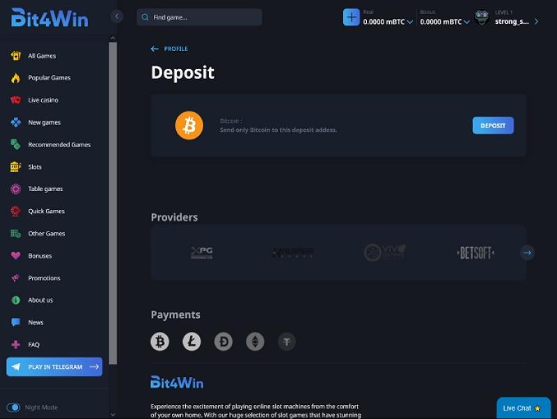 Bit4win カジノは、 Evolution Gaming 、Endorphina、BetSoft、Pragmatic Play などの多くの評判の高いオンライン カジノ コンテンツ プロバイダーと提携し、プレイヤーに興味深いゲーム コレクションを提供しています。