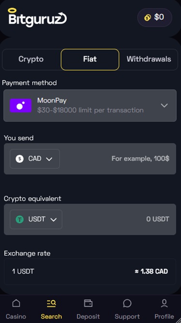 上部の検索バーを使用すると、カジノが用意している 6,000 種類のゲームをすばやく検索できます。また、右上隅のウォレットを使用すると、入金セクションに移動できます。