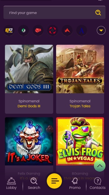 このオンラインカジノのプラットフォームは、シンプルながらも鮮やかなデザイン、芸術的なディテール、カスタムデザインのアイコン、そして魅力的なプレイヤーアバターが特徴です。紫の色合いが美しく落ち着いた雰囲気を醸し出し、目を楽しませてくれます。全体的な印象としては、カテゴリーとセクションが整理されており、ページ内のナビゲーションもスムーズです。