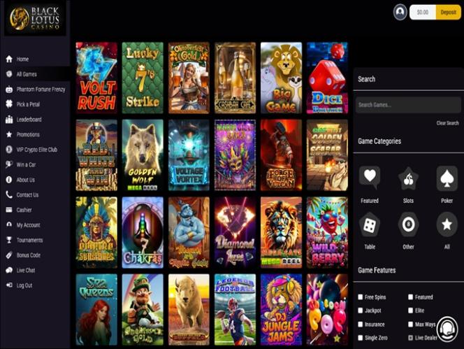 Black Lotus Casinoは Microgaming, Net Entertainment, BetSoft, Amatic Industries, Espresso Games, Rival, Saucify, Vivo Gaming, Endorphina, GameArt, Betgames, Booongo, Felix Gaming, Red Rake Gaming, Inbet Games, Fugaso, Belatra Games, Kalamba, Platipus Gaming, Nucleus Gaming, Spinmatic, Spadegaming, BGAMING, Fazi, Evoplay, SA Gaming, OneTouch, Pocket Games Soft, Triple PG, Mascot Gaming, TVBet, NetGame Entertainment, TrueLab Games, Mancala Gaming, 7Mojos, SmartSoft Gaming, KA Gaming, Atmosfera, Caleta Gaming, Amusnet Interactive, Tom Horn Gaming, Genii, Mr Slotty, Apollo Games, NetGaming, PlayStar, Vibra Gaming, Gamzix, Triple Cherry, Dragon Gaming, Amigo Gaming and Funky Gamesを採用しており、カジノのゲームはウェブベースのインスタントプレイプラットフォームを通じて提供されます。このプラットフォームは、お気に入りのインターネットブラウザから直接起動できます。また、モバイルプレイにも完全対応しており、スマートフォンやタブレットでもプレイできます。