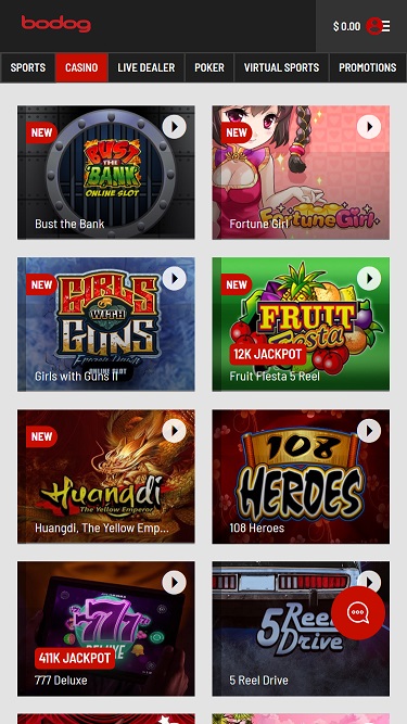 Bodog.comは Microgaming, BetSoft, Big Time Gaming, Evolution Gaming, Ezugi, Genesis Gaming, Habanero Systems, lightningboxgames, Oryx, Rabcat, Rival, Wazdan, Realistic Games, Booming Games, Pragmatic Play, Spinomenal, Fantasma Games, Kalamba, Revolver Gaming, Skywind, Spadegaming, Triple Edge Studios, BGAMING, Evoplay, Stormcraft Studios, Pocket Games Soft, All41 Studios, Gameburger Studios, Pulse 8 Studios, Neon Valley Studios, Golden Rock Studios, SpinPlay Games, Qora Games, SmartSoft Gaming, Buck Stakes Entertainment, Games Global, 2by2 Gaming, bluberi, Leander Games, WMS, SG Interactive, Gamomat, Scientific Games, Bally Wulff, Foxium, Zitro, Just For The Win, PearFiction Studios, Wild Streak Gaming, Slingshot Studios, Golden Hero, Fortune Factory Studios, Crazy Tooth Studio, NetGaming, Japan Technicals Games, Snowborn Games, Hacksaw Gaming, Aurum Signature Studios, Area Vegas, 3 Oaks Gaming, Wishbone Games, NextSpin, Spribe, Gaming Corps, Nailed It! Games, Playnova, Atomic Slot Lab, Neko Games, Reel Kingdom, Oros Gaming, Indigo Magic and Light & Wonderを採用しており、カジノゲームはインターネットブラウザから直接起動するウェブベースのインターフェースで提供されます。同社のプラットフォームはスムーズで操作しやすく、コンピューターのリソースをあまり消費しません。モバイルゲームにも対応しており、スマートフォンやタブレットから賭けることができます。