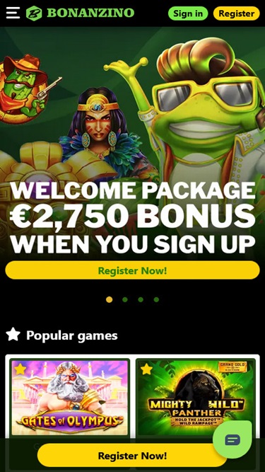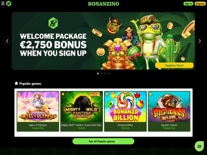 Bonanzino に入ると、プレイヤーはミニマルなホームページに迎えられます。このページでは、不必要な情報でプレイヤーを圧倒するのではなく、獲得して参加できる最も有利なプロモーションを記載したスクロール可能なバナーがすぐに表示されます。