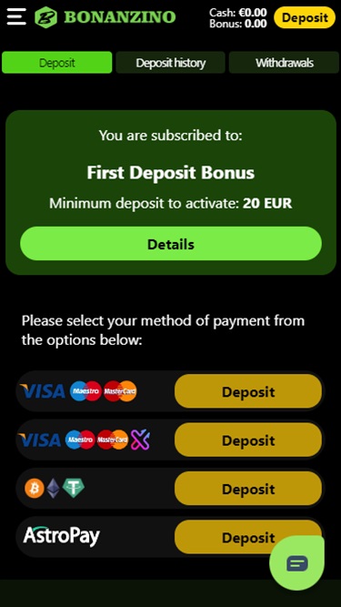 プレイヤーは、 Visa 、 Mastercard 、 Maestro 、 Astropay 、 Flexepin 、 Neteller 、 Neosurf 、 Paysafecardといった従来の銀行決済をご利用いただけます。また、ビットコイン、イーサリアム、テザーといった暗号通貨など、より安全で匿名性の高い決済方法もご利用いただけます。