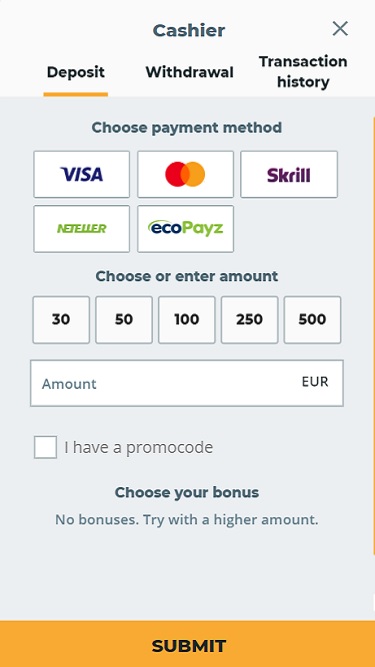 銀行システムは優れており、入出金はNeteller、Skrill、Visa、銀行振込で処理されます。入金はMasterCard、SOFORT、Paysafecard、Giropay、Poli、iDeal、Trustly、WebMoneyでも可能です。出金処理は数分から48時間以内で完了し、出金限度額は週7,000ユーロ、月10,000ユーロです。