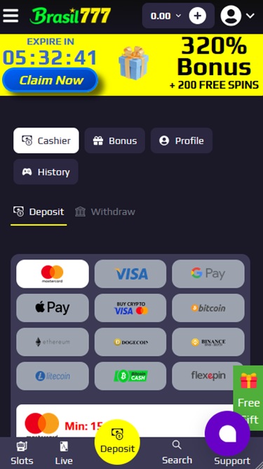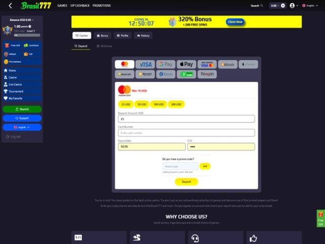 銀行オプションに関しては、Brasil777 はVisa 、 Mastercard 、銀行電信送金、 Apple Pay 、 Google Pay 、 Interacなど、プレイヤーが使用できるさまざまな方法を受け入れます。カジノでは、 Bitcoin 、 Bitcoin Cash 、 Dogecoin 、 Ethereum 、 Litecoin 、 USD Coin 、 Tetherなどのさまざまな暗号通貨も受け入れます。