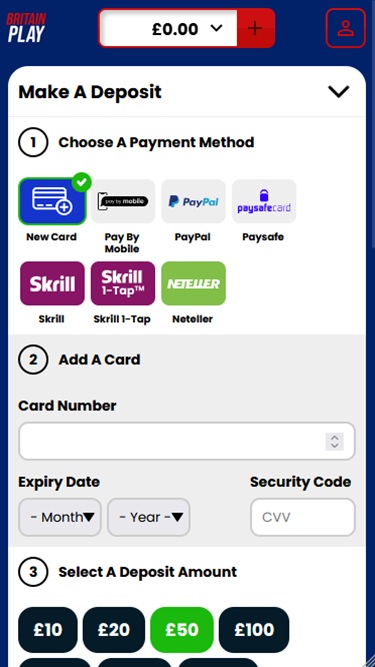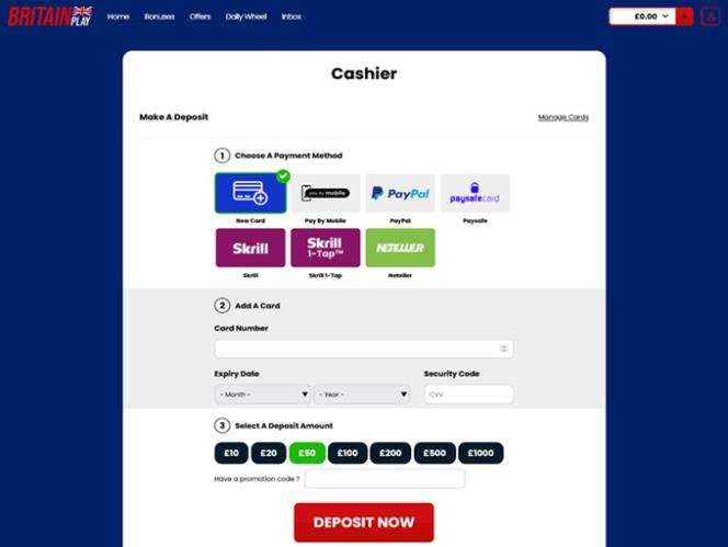 Britainplayのキャッシャーでは、主に従来の銀行決済方法とオプションをご利用いただけます。プレイヤーは、人気のeウォレット、モバイル決済、またはペイメントカードで入金できます。