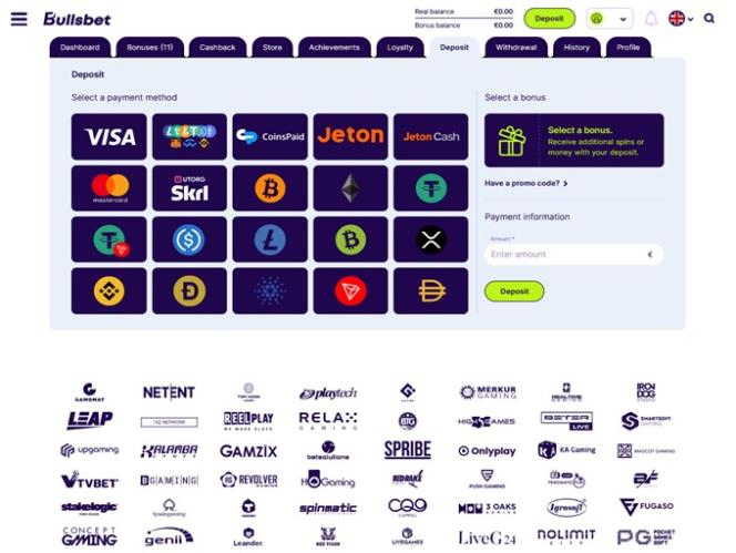 BullsBetカジノは、iGamingのパイオニアから、新しいメカニクスや魅力的な報酬システムなどの導入に注力する革新的な新興開発会社まで、多数のソフトウェアスタジオと提携しています。プレイヤーは、Evolution Gaming、Yggdrasil、Quickspinなどのゲームサプライヤーが提供するコンテンツを閲覧できます。