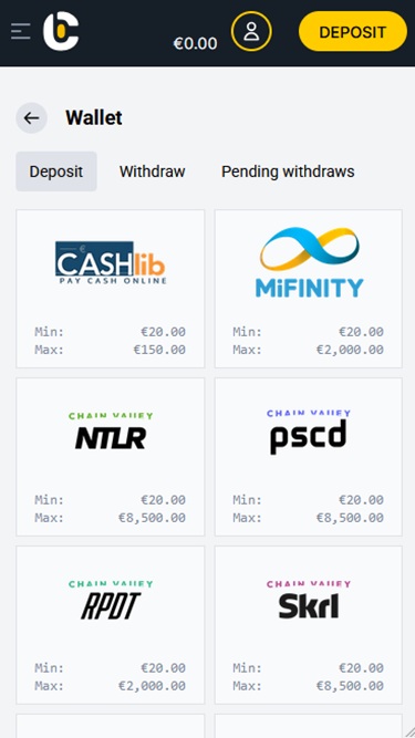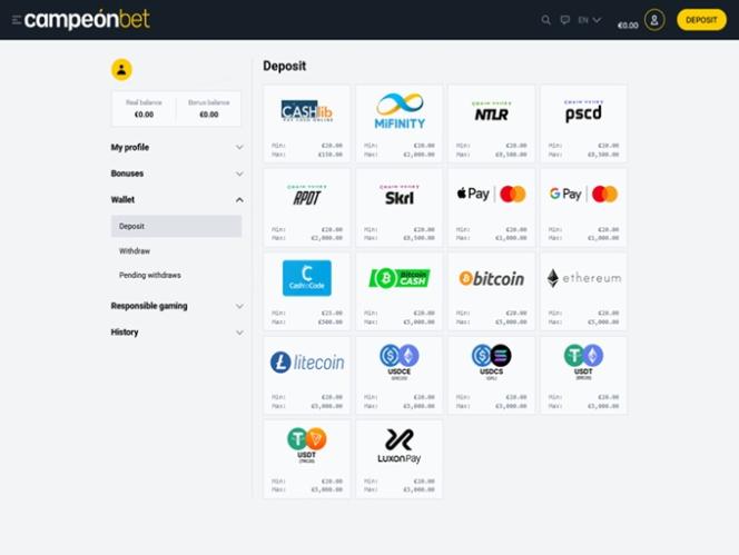 CampeonBetの銀行システムは十分に整備されており、Jeton、Visa、ecoPayz、MasterCard、Sofort、Multibanco、Skrill、Netellerによる入金・出金に対応しています。すべての出金は12時間以内に処理され、銀行オプションに関連する手数料はかかりません。
