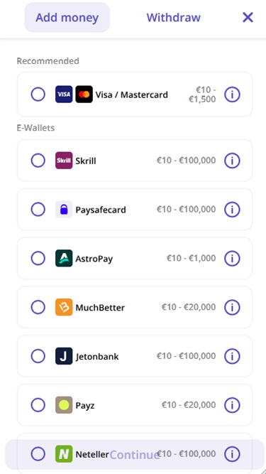 サポートされている通貨には、ビットコイン、ビットコイン キャッシュ、イーサリアム、ライトコイン、リップル、テザー、米ドル、カナダドル、ユーロ、ノルウェークローネ、日本円、インドルピーなどがあります。オンラインギャンブルでは一部の支払い方法が国によって制限されている場合があるため、利用可能かどうかはゲームの管轄区域によって異なりますのでご了承ください。