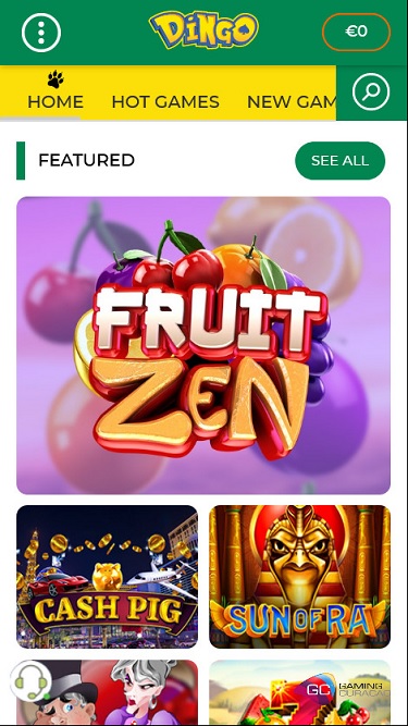 Casino Dingoは Microgaming, BetSoft, 1x2gaming, Big Time Gaming, ELK Studios, Evolution Gaming, Ezugi, Habanero Systems, playson, Rabcat, Rival, SOFTSWISS, Thunderkick, Vivo Gaming, Yggdrasil, Wazdan, Booming Games, PlayPearls, BetConstruct, Pragmatic Play, Nolimit City, Red Tiger Gaming, Booongo, LuckyStreak, Spinomenal, Felix Gaming, Skillzzgaming, Fugaso, Kalamba, Revolver Gaming, Nucleus Gaming, Triple Edge Studios, BGAMING, Northern Lights Gaming, Evoplay, Stormcraft Studios, Switch Studios, SA Gaming, All41 Studios, TVBet, Gameburger Studios, Pulse 8 Studios, Neon Valley Studios, Swintt, Super Spade Games, TrueLab Games, SpinPlay Games, Real Dealer Studios, Holle Games, Caleta Gaming, Games Global, Blueprint Gaming, GameScale, Mr Slotty, Reel Time Gaming, betiXon, Iron Dog Studio, Old Skool Studios, Foxium, Just For The Win, Reflex Gaming, PearFiction Studios, Wild Streak Gaming, Slingshot Studios, Fortune Factory Studios, RubyPlay, 4ThePlayer, AvatarUX, ReelPlay, Alchemy Gaming, Black Pudding Games, Snowborn Games, Boomerang Studios, SimplePlay, Bang Bang Games, Half Pixel Studios, Dragon Gaming, Peter And Sons, Eurostar Studios and Aurum Signature Studiosを採用しており、カジノゲームはウェブベースのインスタントプレイプラットフォームを通じて提供されます。このプラットフォームはインターネットブラウザから直接読み込まれます。ゲームの種類は競合他社に比べて少ないですが、質は良好です。モバイルプレイも利用可能で、スマートフォンやタブレットでもゲームをプレイできます。