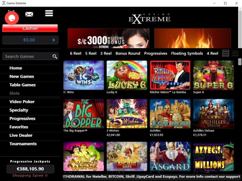 Casino Extremeは Real Time Gaming, Visionary iGaming and Spinlogic Gamingを採用しており、数十種類のゲームを揃えています。ダウンロード可能なソフトウェアでプレイできるほか、ウェブブラウザからプレイできるインスタントプレイオプションもご利用いただけます。