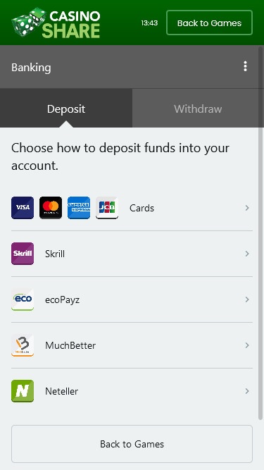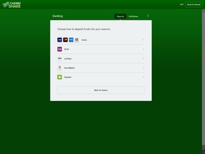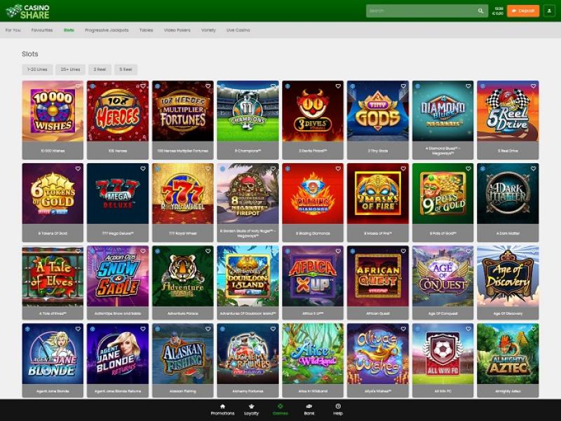 Casino Shareは Microgaming, Evolution Gaming, Rabcat, Triple Edge Studios, Stormcraft Studios, All41 Studios, Gameburger Studios, Neon Valley Studios, Real Dealer Studios, Games Global, Foxium, Just For The Win and Slingshot Studiosを採用しており、プレイヤーに数百ものゲームの選択肢を提供しています。カジノは優れたウェブプラットフォームを提供しており、プレイヤーはソフトウェアをダウンロードすることなくゲームにアクセスできます。Blackjack
