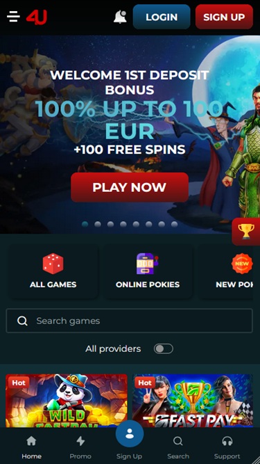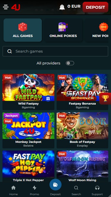 Casino4uは Microgaming, Net Entertainment, Playtech, BetSoft, Amatic Industries, EYECON, Habanero Systems, lightningboxgames, Oryx, Play'n GO, playson, Quickspin, Thunderkick, Yggdrasil, Endorphina, Wazdan, Realistic Games, GameArt, Pragmatic Play, Nolimit City, Booongo, Spinomenal, Red Rake Gaming, Skillzzgaming, Belatra Games, Kalamba, Platipus Gaming, Nucleus Gaming, Triple Edge Studios, BGAMING, Northern Lights Gaming, Evoplay, Stormcraft Studios, IGTech, Bulletproof Games, All41 Studios, Gluck Games, Mascot Gaming, NetGame Entertainment, Gameburger Studios, Pulse 8 Studios, Neon Valley Studios, Golden Rock Studios, Swintt, TrueLab Games, SpinPlay Games, Mancala Gaming, HungryBear Gaming, KA Gaming, GONG Gaming, Holle Games, Buck Stakes Entertainment, Games Global, Reevo, Amusnet Interactive, Ash Gaming, CT Interactive, Tom Horn Gaming, Mr Slotty, Old Skool Studios, Foxium, Just For The Win, Reflex Gaming, PearFiction Studios, Wild Streak Gaming, Slingshot Studios, Fortune Factory Studios, Gamevy, Crazy Tooth Studio, ReelPlay, Japan Technicals Games, Alchemy Gaming, Rarestone Gaming, Snowborn Games, Boomerang Studios, Max Win Gaming, Gold Coin Studios, Bang Bang Games, Half Pixel Studios, Arcadem, Peter And Sons, Eurostar Studios, Aurum Signature Studios, Onlyplay, Area Vegas, 3 Oaks Gaming, Wishbone Games, Apparat Gaming, Circular Arrow, Bet2Tech, HammerTime Games, INO Games, Nailed It! Games, Atomic Slot Lab, Reel Kingdom, Oros Gaming and Popiplayを採用しており、カジノゲームはウェブベースのプラットフォームで提供されています。サイトは操作が簡単で、ボタンを使ってプロバイダー別にゲームを選択できます。モバイルサポートも提供されているため、スマートフォンやタブレットでもプレイできます。Blackjack