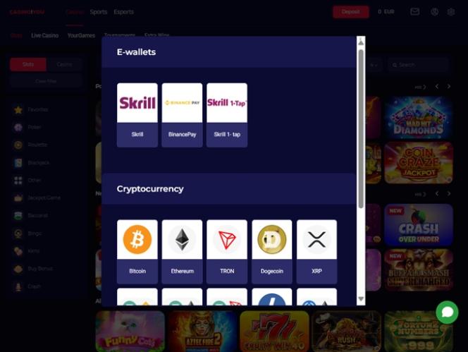 CasinoAndYouは、Visa、Mastercard、Skrill、Netellerといった定番のクレジットカードに加え、Bitcoin、Ethereum、Litecoin、TRON、Dogecoin、USDTなど30種類以上の仮想通貨を含む50種類以上の決済方法に対応しています。また、PaparaやJetonといった地域密着型の決済ソリューションもサポートしており、地域のプレイヤーにとってより便利な決済手段となっています。