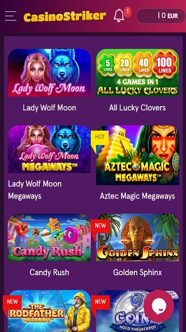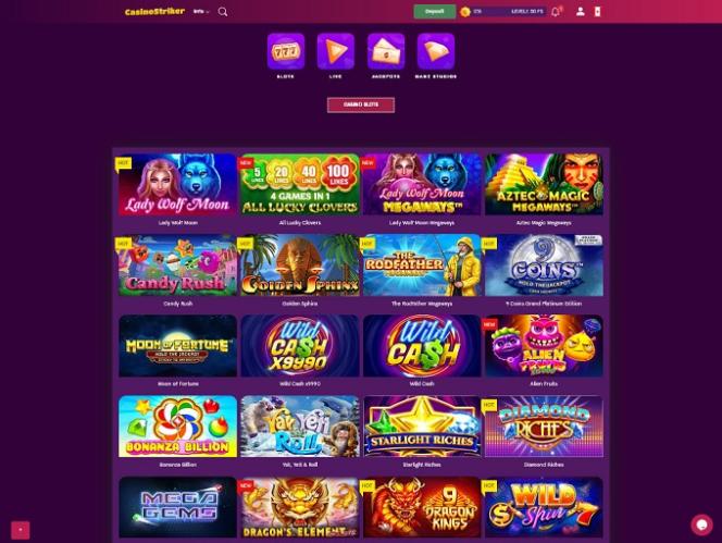 CasinoStrikerのカラーパレットに関しては、淡い紫色の背景に黄色のアクセントが加えられています。見た目は心地よく、無駄な装飾は一切ありません。ギャンブルサイトのデザインにシンプルなアプローチを好むプレイヤーなら、きっと気に入るでしょう。