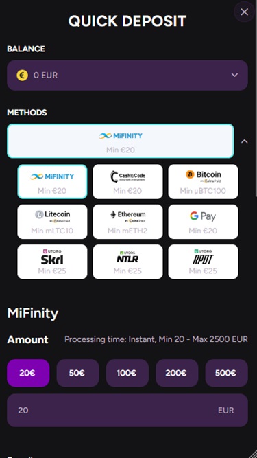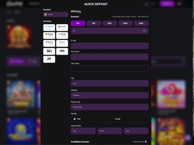 カジノブランドがプレイヤーに複数の決済方法を提供していることは、私たちにとって大変ありがたいことです。Casinyも例外ではありません。Visa 、 Mastercard 、銀行振込、 AstroPay 、 Google Pay 、 Neosurf 、 Skrill 、 Netellerといった従来の決済方法に加え、ビットコイン、ライトコイン、テザー、イーサリアムといった暗号通貨での入金も可能です。