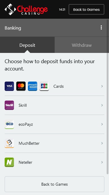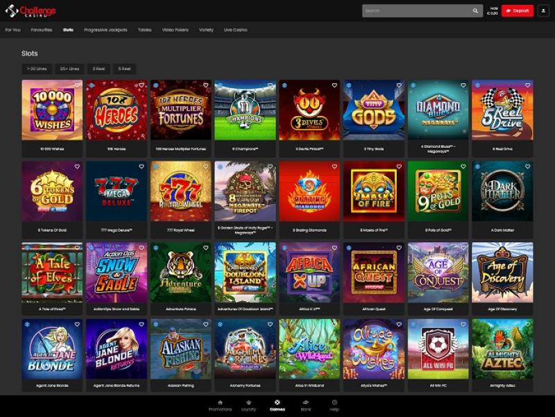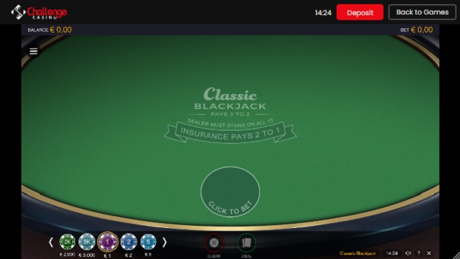 Challenge Casinoは Microgaming, Evolution Gaming, Rabcat, Triple Edge Studios, Northern Lights Gaming, Stormcraft Studios, Switch Studios, Electric Elephant Games, All41 Studios, Gameburger Studios, Pulse 8 Studios, Neon Valley Studios, SpinPlay Games, Real Dealer Studios, GONG Gaming, Buck Stakes Entertainment, Games Global, Old Skool Studios, Foxium, Just For The Win, PearFiction Studios, Slingshot Studios, Fortune Factory Studios, Crazy Tooth Studio, Alchemy Gaming, Snowborn Games, Gold Coin Studios, Half Pixel Studios, Eurostar Studios and Aurum Signature Studiosを採用しており、数百ものゲームをライブラリに揃えています。これらのゲームはFlashベースのプラットフォームで提供されており、ブラウザでプレイできます。また、ゲームをパソコンに直接インストールしたいプレイヤー向けにダウンロード版も提供しています。Blackjack
