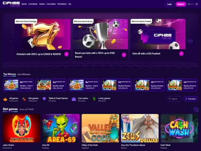 Cipher Winsは、リアルマネースロット、ライブディーラー、クラッシュゲーム、テーブルゲームなど、多様なカジノゲームを取り揃えたモダンなギャンブルサイトです。豊富なスポーツベッティングセクションを備え、ユーザーに様々なベッティングオプションを提供しています。また、プレイヤーが利用できる様々なボーナスやプロモーションを含む包括的なプロモーションプログラムも提供しています。