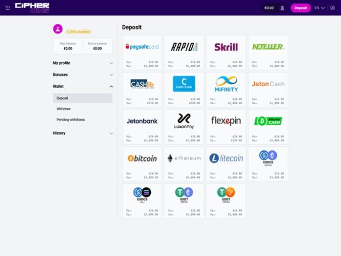 ロイヤルティプログラムの詳細は不明ですが、Cipher Winsではプレイヤーの皆様にどのようなプロモーションやボーナスをご用意しているか把握しております。新規プレイヤーの皆様には、スポーツベッティングとカジノゲームの両方でご利用いただける入金マッチボーナスを含むウェルカムパッケージをご用意しております。