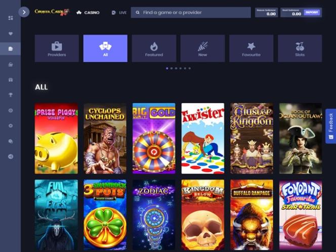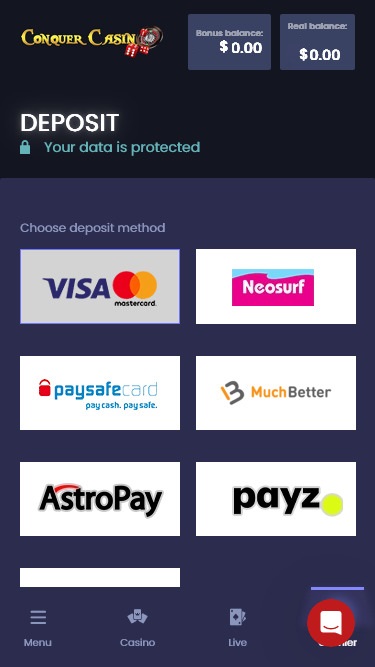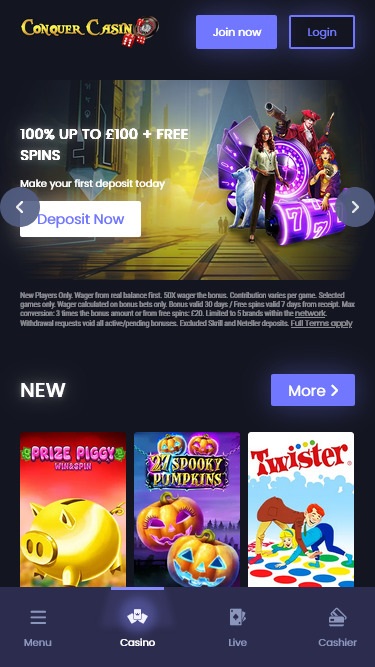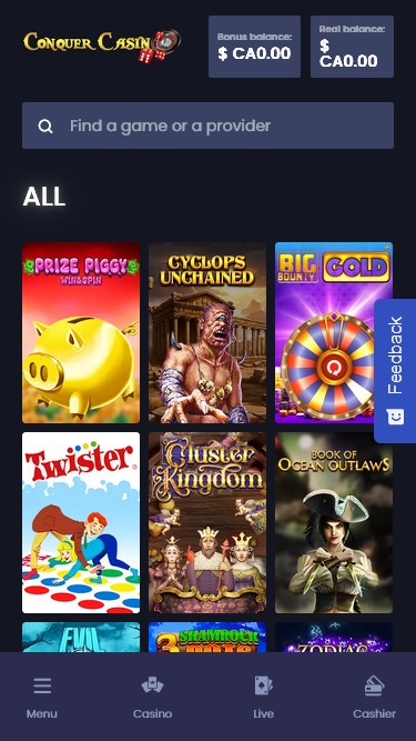 Conquer Casinoは Microgaming, Net Entertainment, Playtech, BetSoft, 1x2gaming, Barcrest, Big Time Gaming, ELK Studios, Evolution Gaming, EYECON, Genesis Gaming, Habanero Systems, lightningboxgames, Play'n GO, playson, Quickspin, Rabcat, Rival, Thunderkick, Vivo Gaming, Wazdan, Booming Games, BetConstruct, Pragmatic Play, Nolimit City, IGT, LuckyStreak, Spinomenal, Skillzzgaming, Fugaso, Fantasma Games, Kalamba, Revolver Gaming, Skywind, Triple Edge Studios, Evoplay, Stormcraft Studios, Switch Studios, All41 Studios, TVBet, Gameburger Studios, Pulse 8 Studios, Neon Valley Studios, Super Spade Games, Shuffle Master, SpinPlay Games, Games Global, 2by2 Gaming, Blueprint Gaming, Games Warehouse, Leander Games, NextGen, NYX Interactive, ProgressPlay, Tom Horn Gaming, WMS, Inspired Gaming, Genii, Red7Mobile, CORE Gaming, Scientific Games, Iron Dog Studio, Foxium, Betdigital, Just For The Win, PearFiction Studios, Slingshot Studios, Fortune Factory Studios, Gamevy, Crazy Tooth Studio, ReelPlay, Alchemy Gaming, SimplePlay, Gold Coin Studios and Half Pixel Studiosを採用しており、カジノゲームはウェブベースのプラットフォームを通じて提供されています。プレイヤーはモバイルサイトも利用でき、スマートフォンとタブレットの両方でプレイできます。